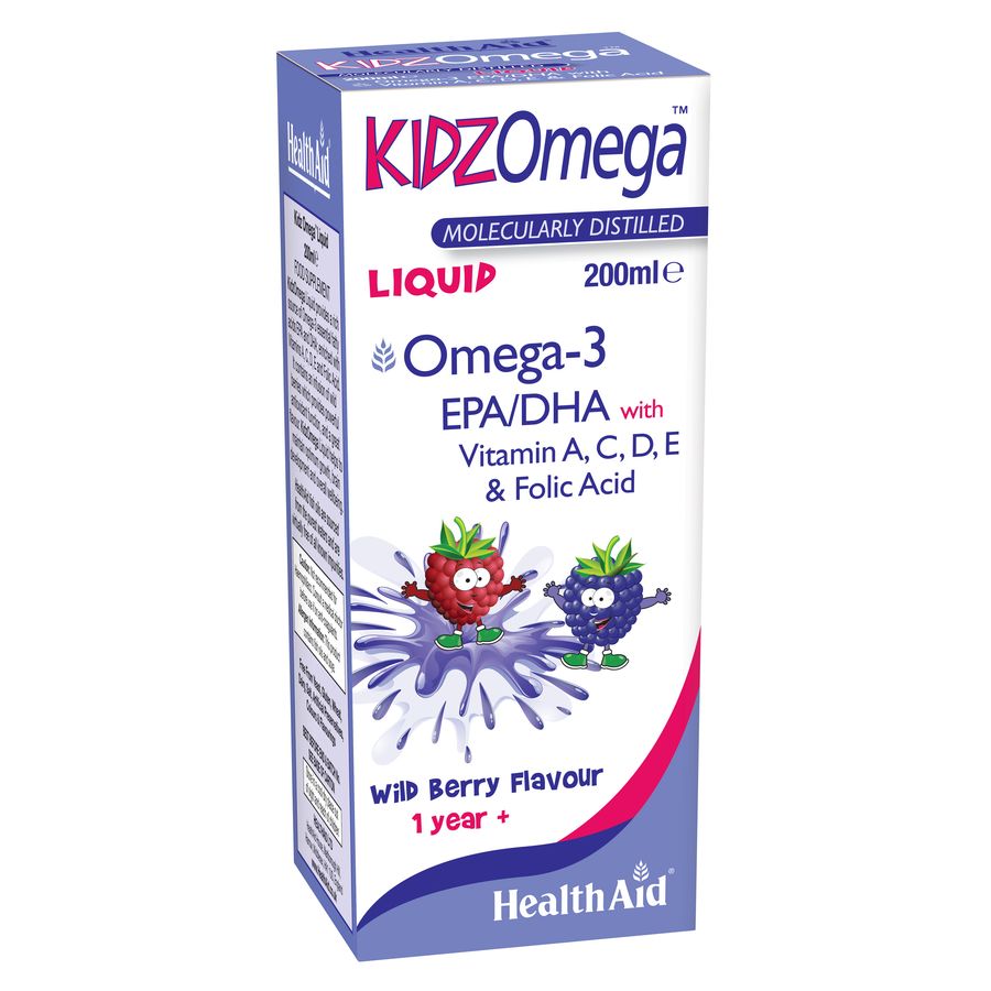 KidzOmega Liquid provides a rich source of Omega-3 essential fatty acids EPA and DHA; enriched with Vitamins A, C, D, E and Folic Acid. It contains an infusion of wild berries which provides powerful antioxidant function, and a great flavour. KidzOmega Liquid helps to maintain optimum growth, brain development and overall wellbeing. HealthAid fish oils are sourced from the purest waters and are virtually contaminant free.