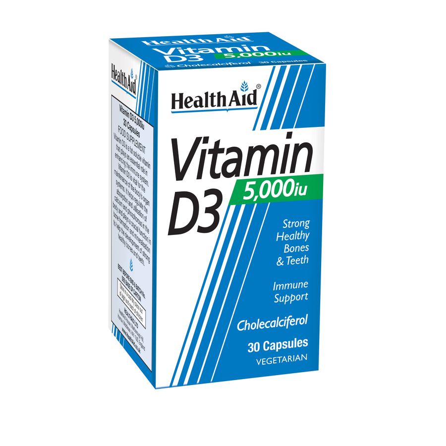 Vitamin D3 is a fat soluble Vitamin that is synthesised in the human body on exposure to sunlight. It plays a vital role in numerous functions of the body .Vitamin D3 is essential for the maintenance of healthy bones and teeth, the absorption of calcium and phosphorus, muscle function and the process of cell division. Vitamin D3 is also beneficial for the enhancement of the hormonal cycle, skin health, mood and cognitive performance. HealthAid Vitamin D3 5,000iu vegetarian capsules provides a highly bioavailable strength of Vitamin D3 (Cholecalciferol) that is the biological precursor of Vitamin D and is known to be more bioactive than Vitamin D2 (Ergocalciferol).